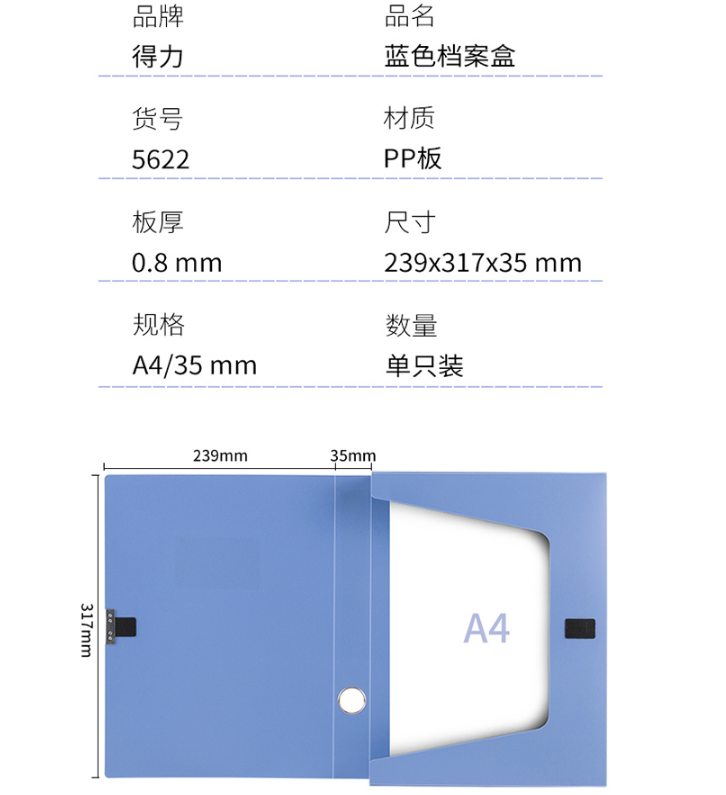 商品名稱:得力(deli)35mmA4塑料檔案盒 資料文件收納盒 財(cái)務(wù)憑證盒 財(cái)務(wù)用品 辦公用品得力(deli)5622 單只裝藍(lán)色