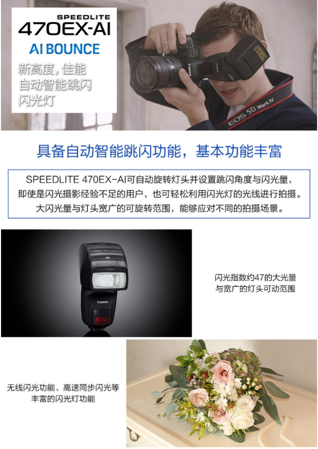 商品名稱:佳能(Canon)閃光燈機(jī)頂外置閃光燈自動(dòng)智能跳閃適用佳能EOS單反相機(jī) 適用佳能單反相機(jī)(EOS R6/ 6D Mark II/5D4/5D3/5DS/5DSR/6D/等單反相機(jī))佳能閃光燈470EX-AI